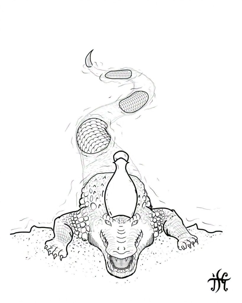 All six images began as pencil sketches on drawing paper, which remains my strong preference even as continue to master (and learn to genuinely love) digital linework and start to really grasp digital colors. The linework was almost all done in Clip Studio Paint 2.0, first on my laptop and then on my desktop, using a Wacom Intuos S graphics tablet (yeah, one of the little ~6x8in ones), with a few sections of the falcon done on my low-end Samsung Galaxy tablet using the mobile version of Clip Studio. I tried sections of the dragon and the crocodile on the tablet, as well, but couldn’t get it to work the way I wanted.