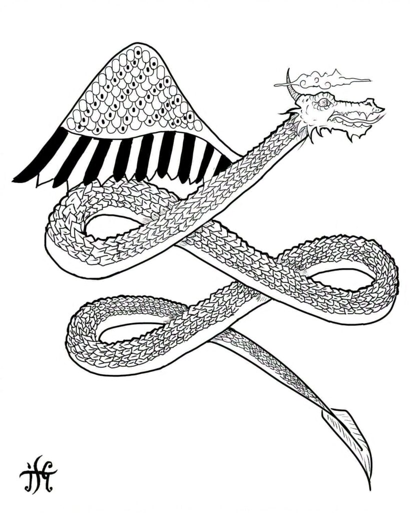 I was, of course, delighted. I’ve only done a handful of commissioned illustrations, but I’ve always wanted to do more. And Polyphanes and I have admired eachother’s work since we were both in college. But it was also a large project, which I feared might be a bit past the edge of my expertise: six figures, three theriomorphic and three anthropoid, drawing on both Eastern and Western visual traditions. Real talk: the dragon and the wizards/priests were right up my alley, and i was excited for the challenge of the pseudo-Egyptian falcon, but the crocodile and the child fucking concerned me.